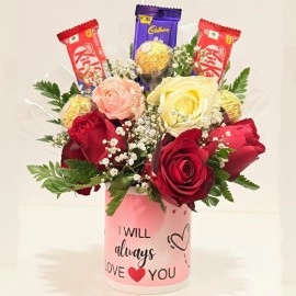 Celebrate your special connection with a gift that blends timeless romance with sweet indulgence. This charming multi-sensory arrangement is meticulously crafted within a keepsake ceramic mug that carries the heartfelt message, "I Will Always Love You". It is the perfect choice for Valentines day,anniversaries, birthdays, or a spontaneous romantic ..