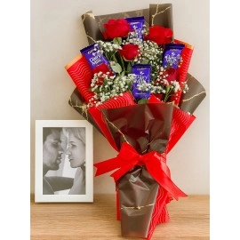 Indulge your loved one with the perfect pairing of sweetness and romance. This elegant bouquet features 3 large 160g Cadbury Dairy Milk chocolates nestled among 5 vibrant red roses. Beautifully arranged and wrapped, it’s a thoughtful gift to express love, appreciation, or to simply brighten someone’s day...