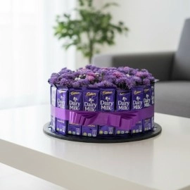 Make your loved ones smile with this luxurious Dairy Milk Chocolate Arrangement ????????.Elegantly crafted with 26 Dairy Milk chocolates (18g each), this round chocolate bouquet is wrapped in a beautiful purple ribbon and topped with matching artificial flowers for a stylish, premium look.Perfect for birthdays, anniversaries, Teacher’s Day, Valenti..